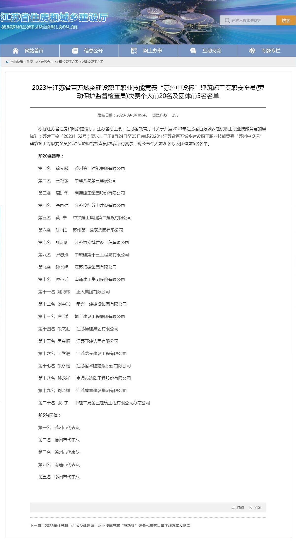 我司基國強(qiáng)同志于8月24日至25日參加由江蘇省住房和城鄉(xiāng)建設(shè)廳、江蘇省總工會、江蘇省教育廳聯(lián)合舉行的2023年江蘇省百萬城鄉(xiāng)建設(shè)職工職業(yè)技能競賽“蘇州中設(shè)杯”建筑施工專職安全員(勞動(dòng)保護(hù)監(jiān)督檢查員)決賽中,取得第四名的優(yōu)異成績,并獲得“省住房城鄉(xiāng)建設(shè)系統(tǒng)技能標(biāo)兵”稱號!特此祝賀!